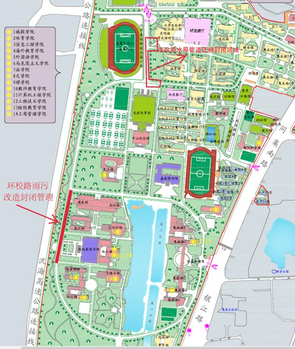 1.从延奎图书馆至建发楼西侧的环校路段封闭,途径该区域车辆请注意绕行。