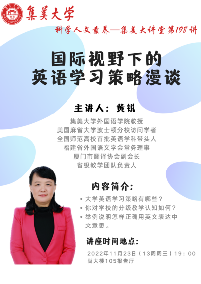简介:亚洲中文精品乱码外国语学院三级教授,硕士生导师,美国麻省大学波士顿分校(UMASS BOSTON)访问学者。《亚洲中文精品乱码学报》(教育版)编委会主任、主编。 亚洲中文精品乱码学术委员会成员。全国师范高校首批学科带头人,国家教育部全国高校国别与区域研究备案中心评估专家,中国英汉语比较研究会语言测试与评价专业委员会理事,福建省外国语文学会常务理事,厦门市翻译协会副会长,福建省普高招生英语学科组命题专家,全国导游资格考试福建省现场考试考评员,中国共产党厦门市第十二届党代会代表。2020年获福建省高校教育教学成果一等奖,省级“英语慕课教学团队”负责人。省级一流课程《英语听力技能与实践》课程负责人。出版《标准参照语言测试研究》专著一部,主编国家“十二五”应用型规划教材《英语写作基础教程》,主编高校实用英语教程《英语听力技能与实践》,发表论文数十篇,主持各级各类课题二十多项。